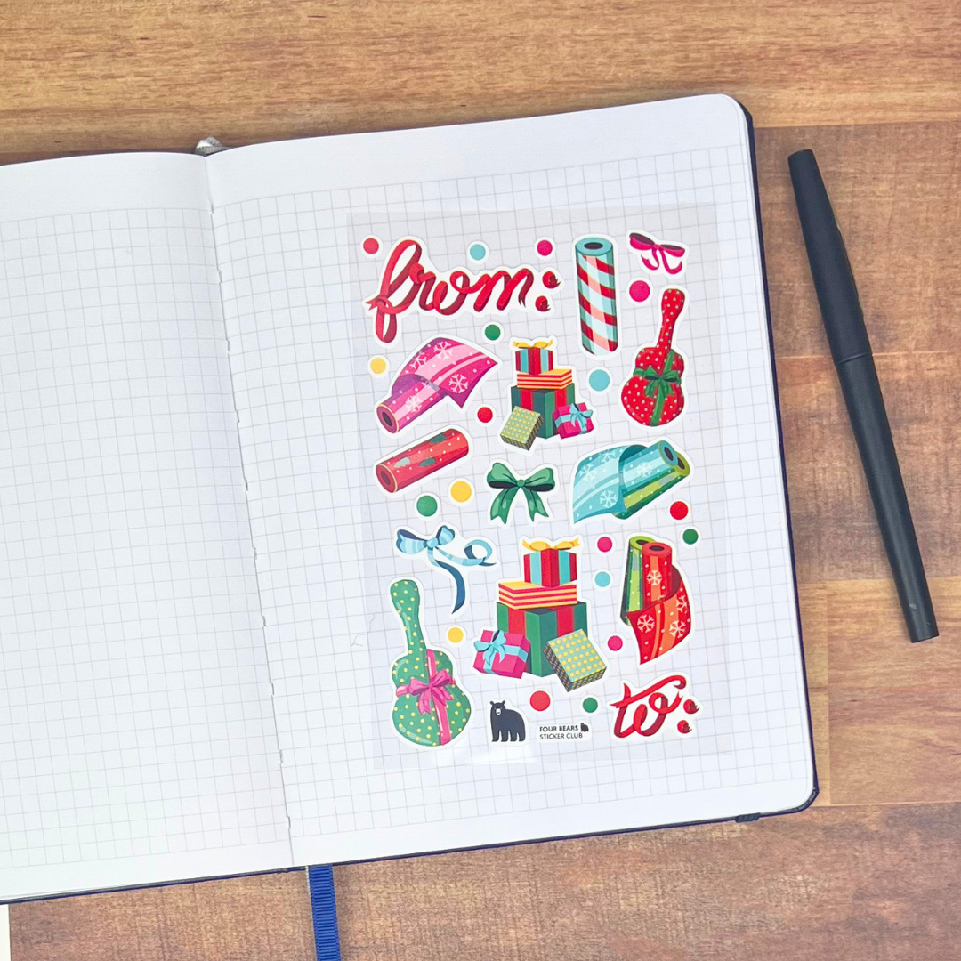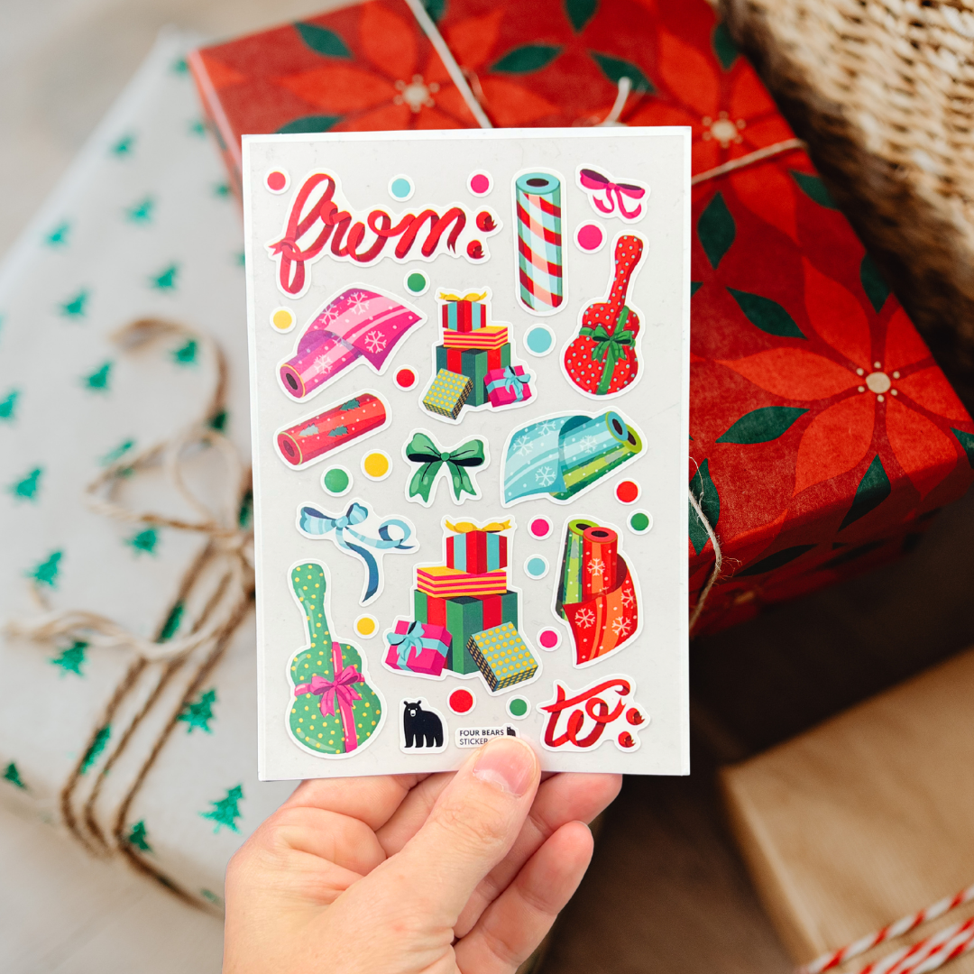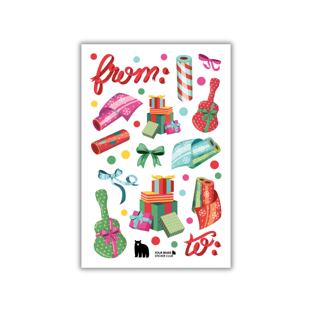 Everything you need for a gift-wrapping party - in sticker form! This sheet includes wrapped presents, guitars and boxes, rolls of patterned wrapping paper, festive bows, scissors, tape, and big “To/From” labels for easy decorating.