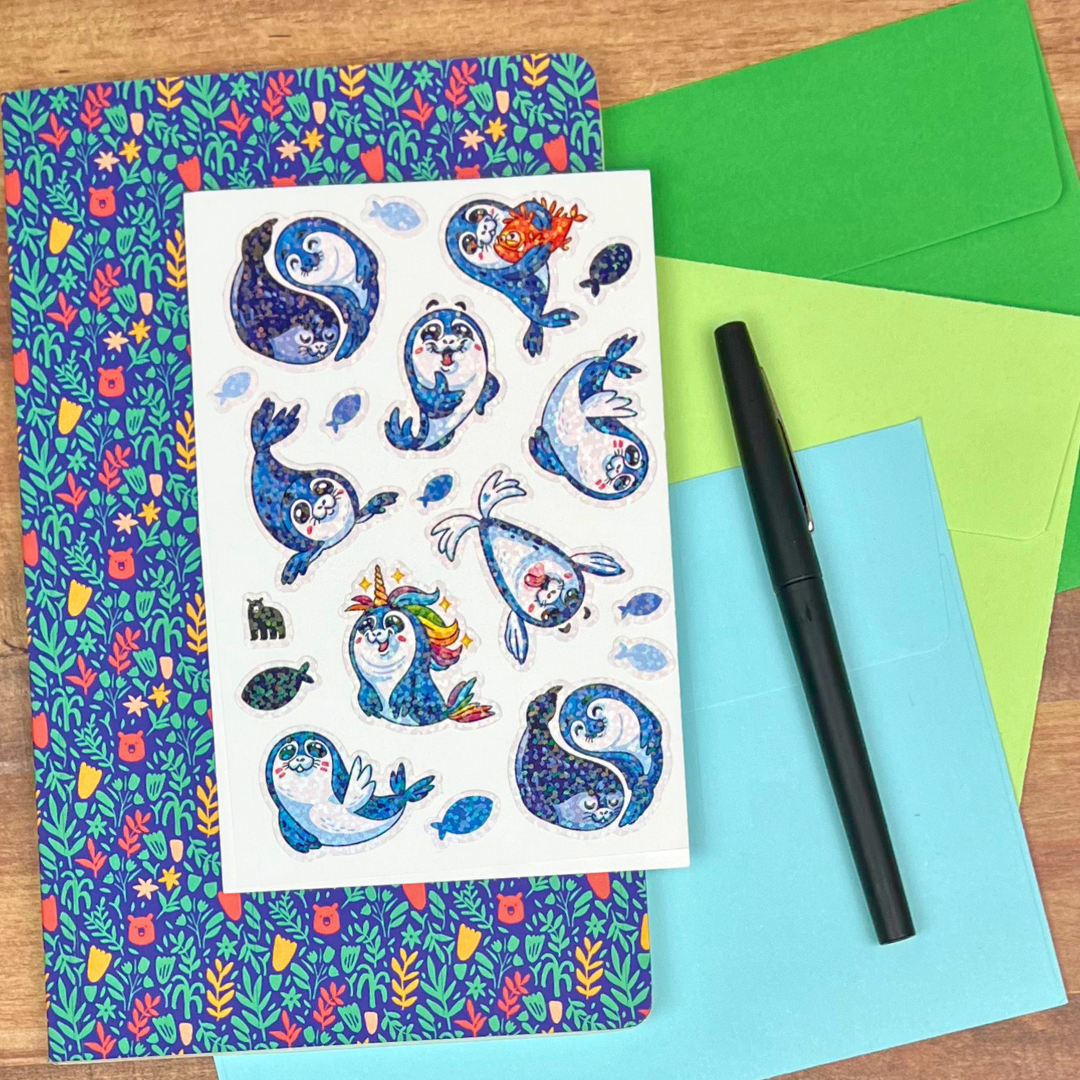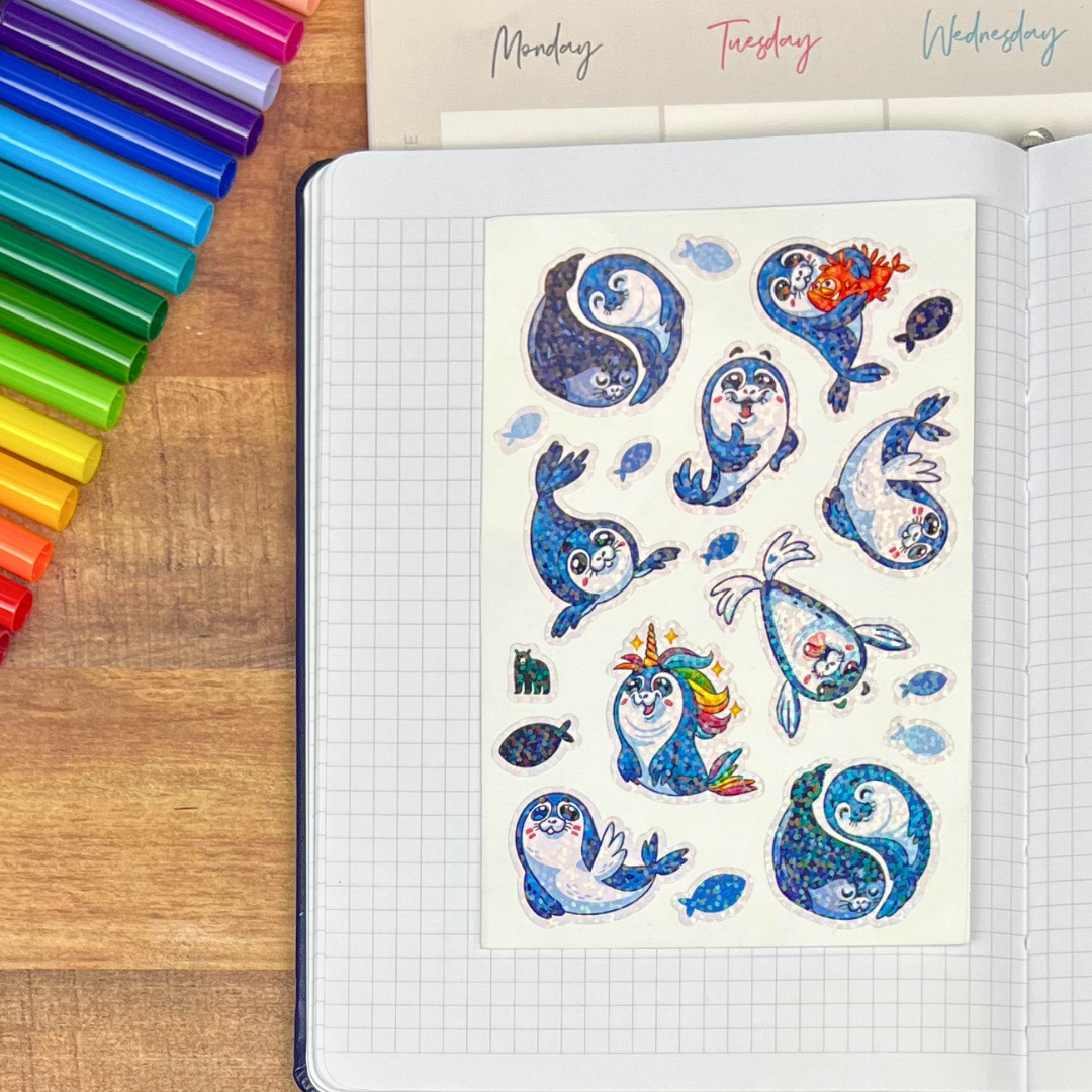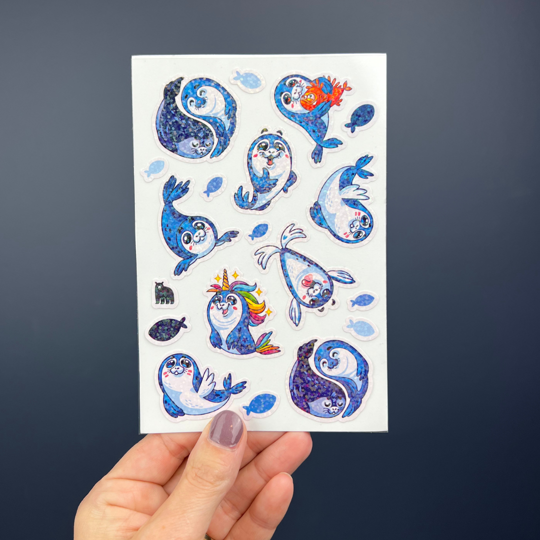 White PVC stickers on a clear backing with silver foil accents