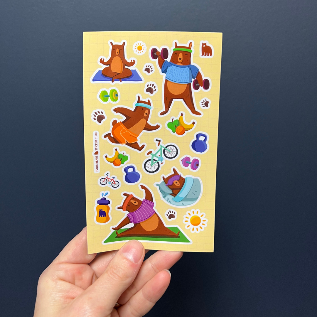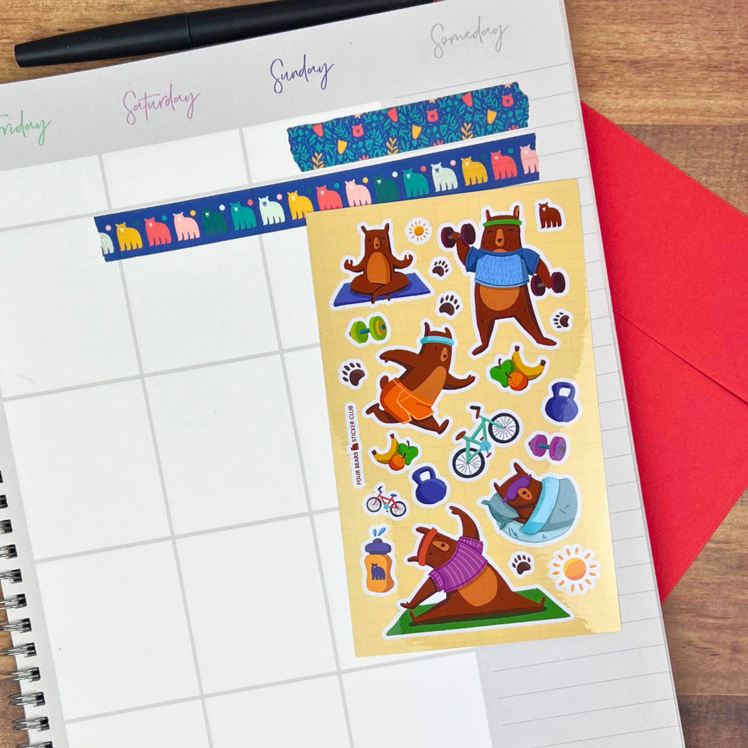 Find your rhythm with Balance, Bear Style, a sticker sheet celebrating everyday care and balance. Featuring bears stretching, resting, nourishing themselves, and moving their bodies, these illustrations offer a reminder that well-being is built through small, every day choices.