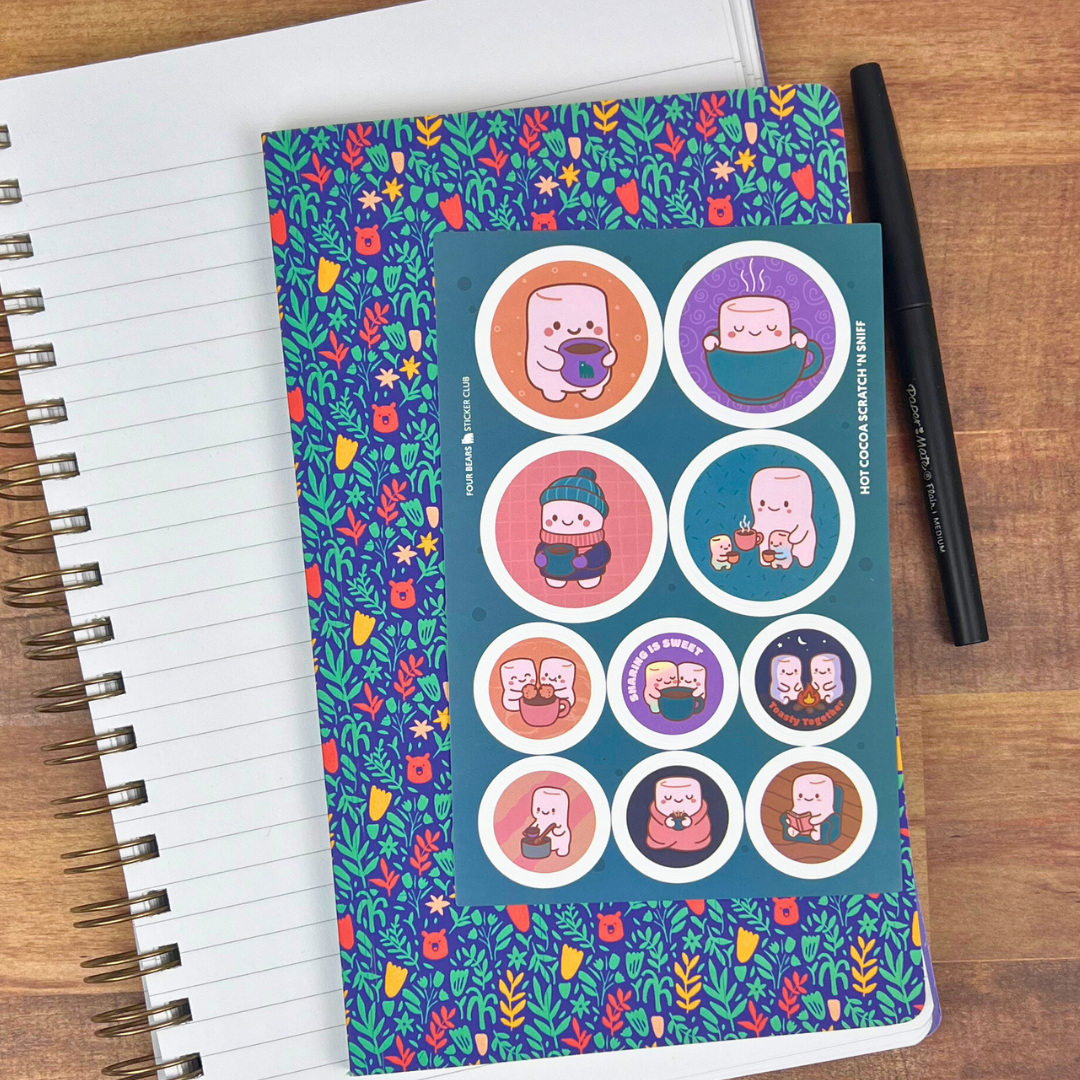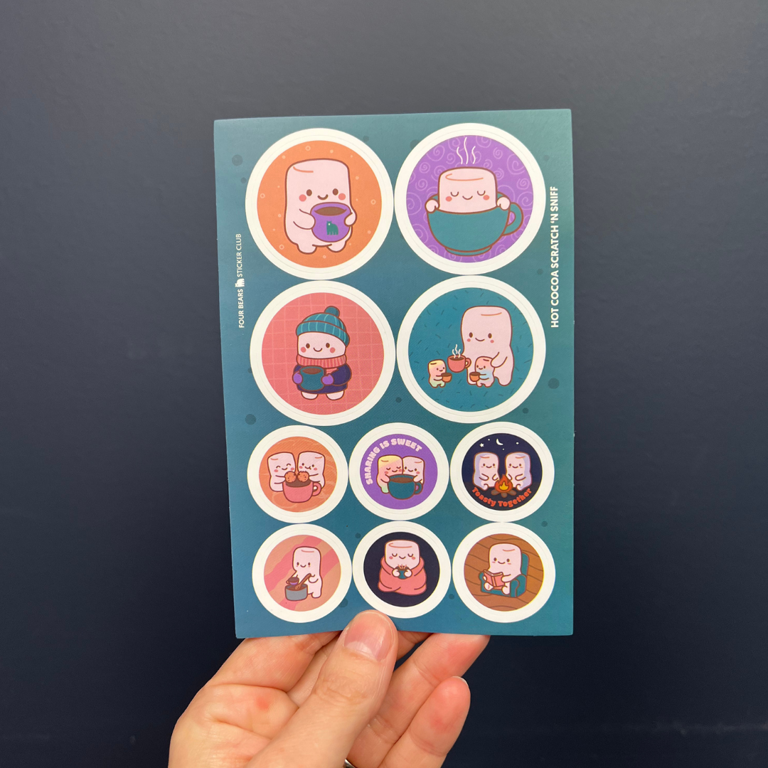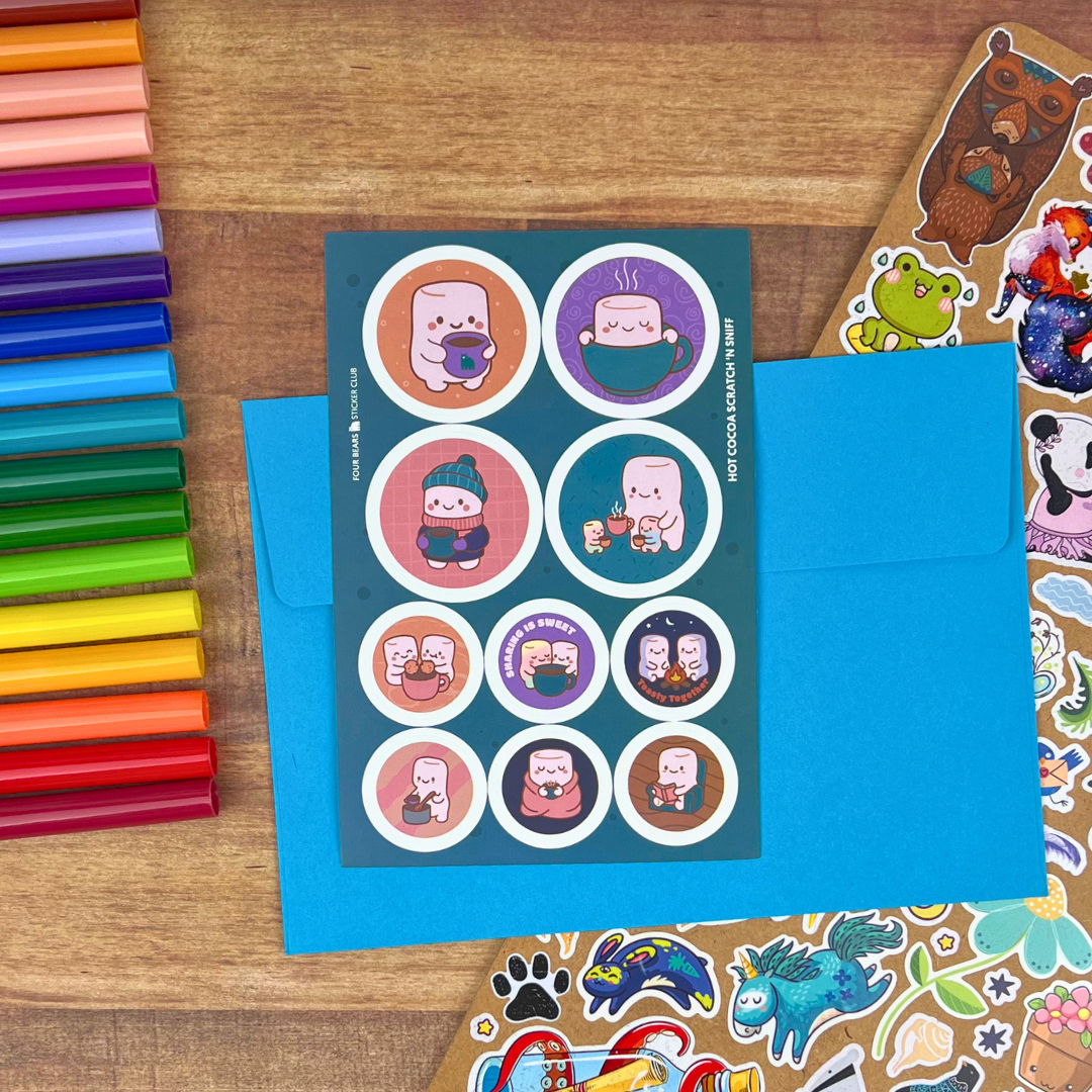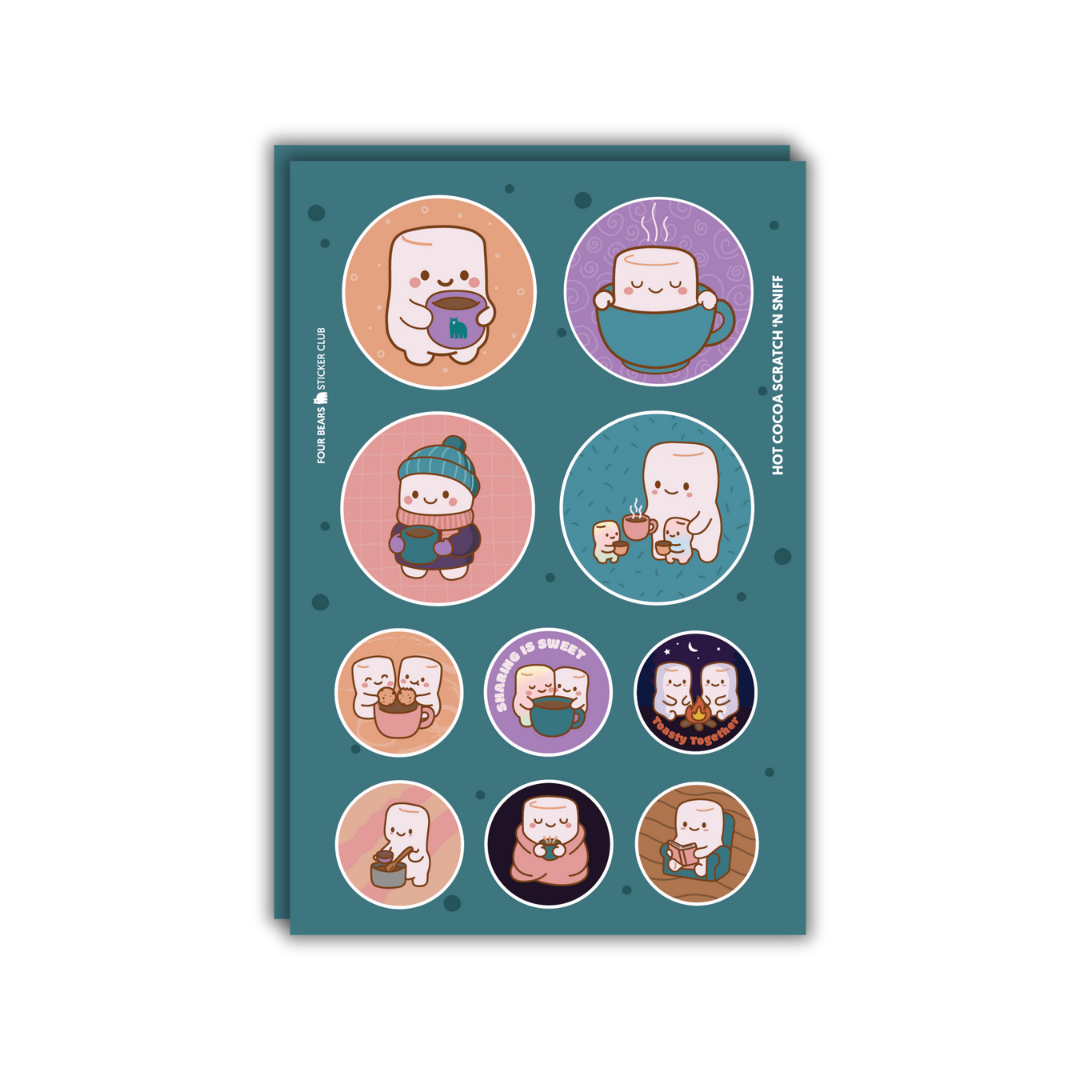 Meet the Cozy Cocoa Crew! This sweet, hot-chocolate-scented sticker sheet features cheerful marshmallows enjoying a warm cup of cocoa - the perfect mix of cute, cozy, and delicious fun.