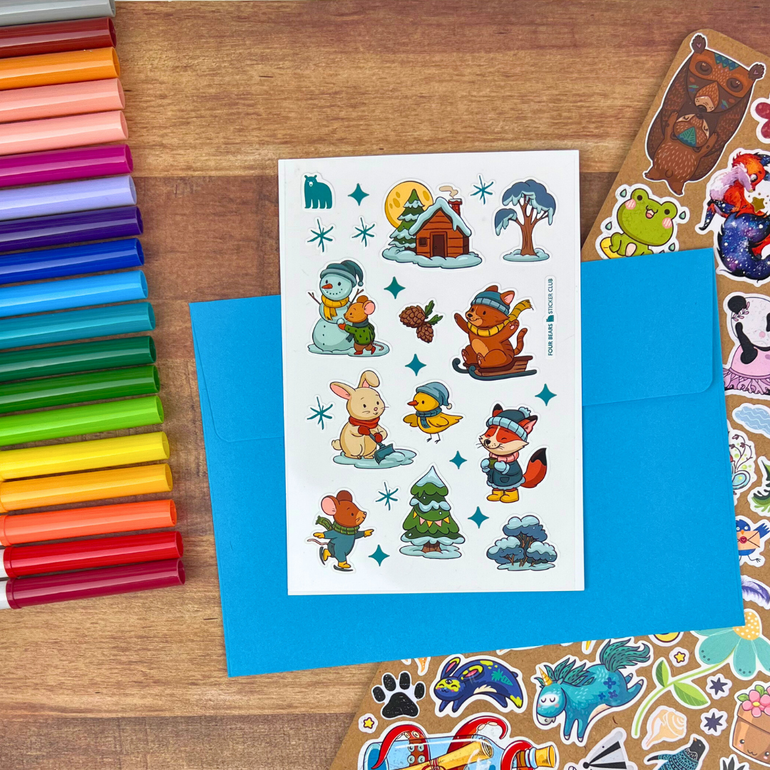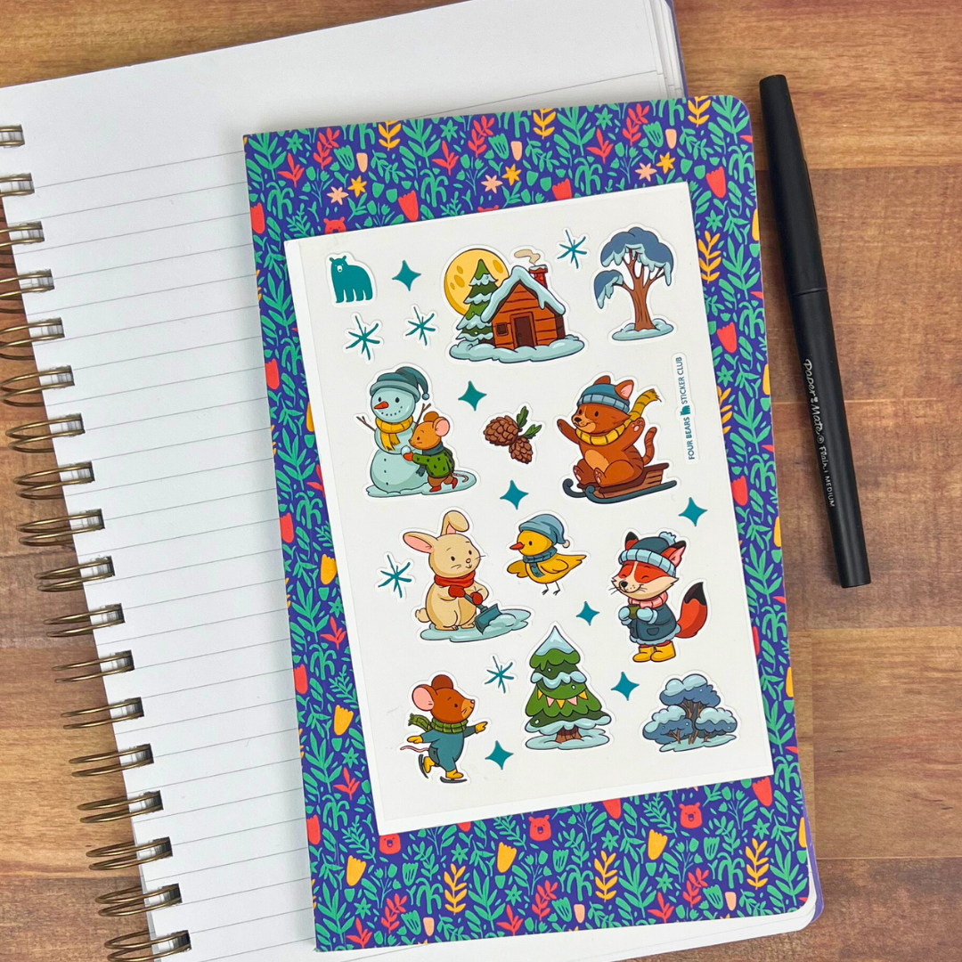 Bundle up and join the Critters in the Cold! This charming sticker sheet features forest animal friends getting ready for winter - shovelling snow, building snowmen, and staying cozy in their warm little cottage. It’s a delightful mix of winter chores, snowy fun, and woodland charm.