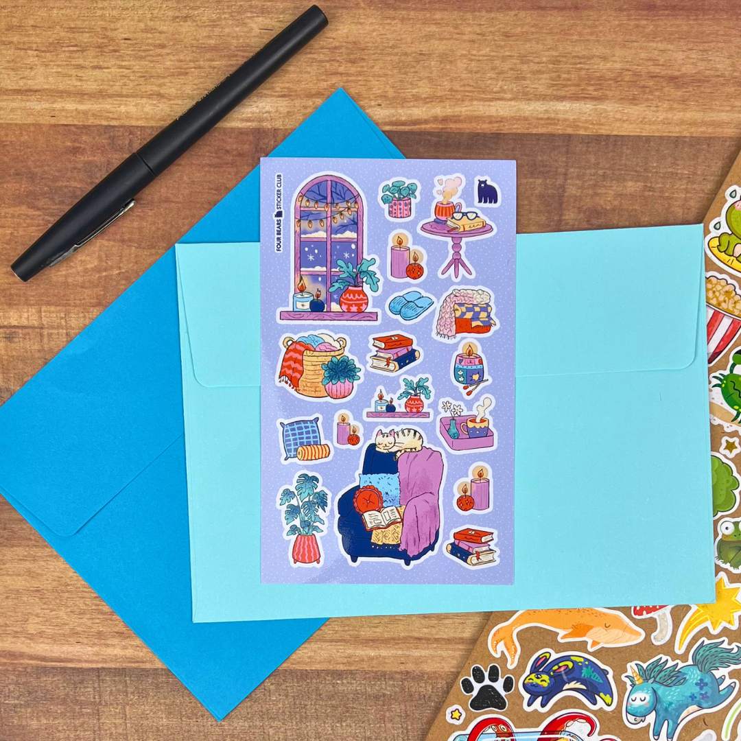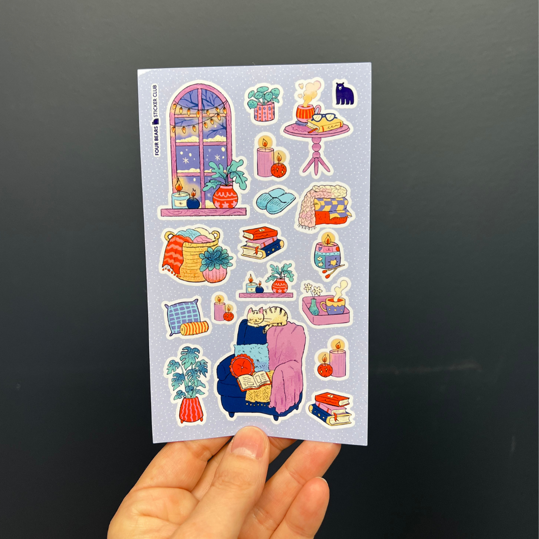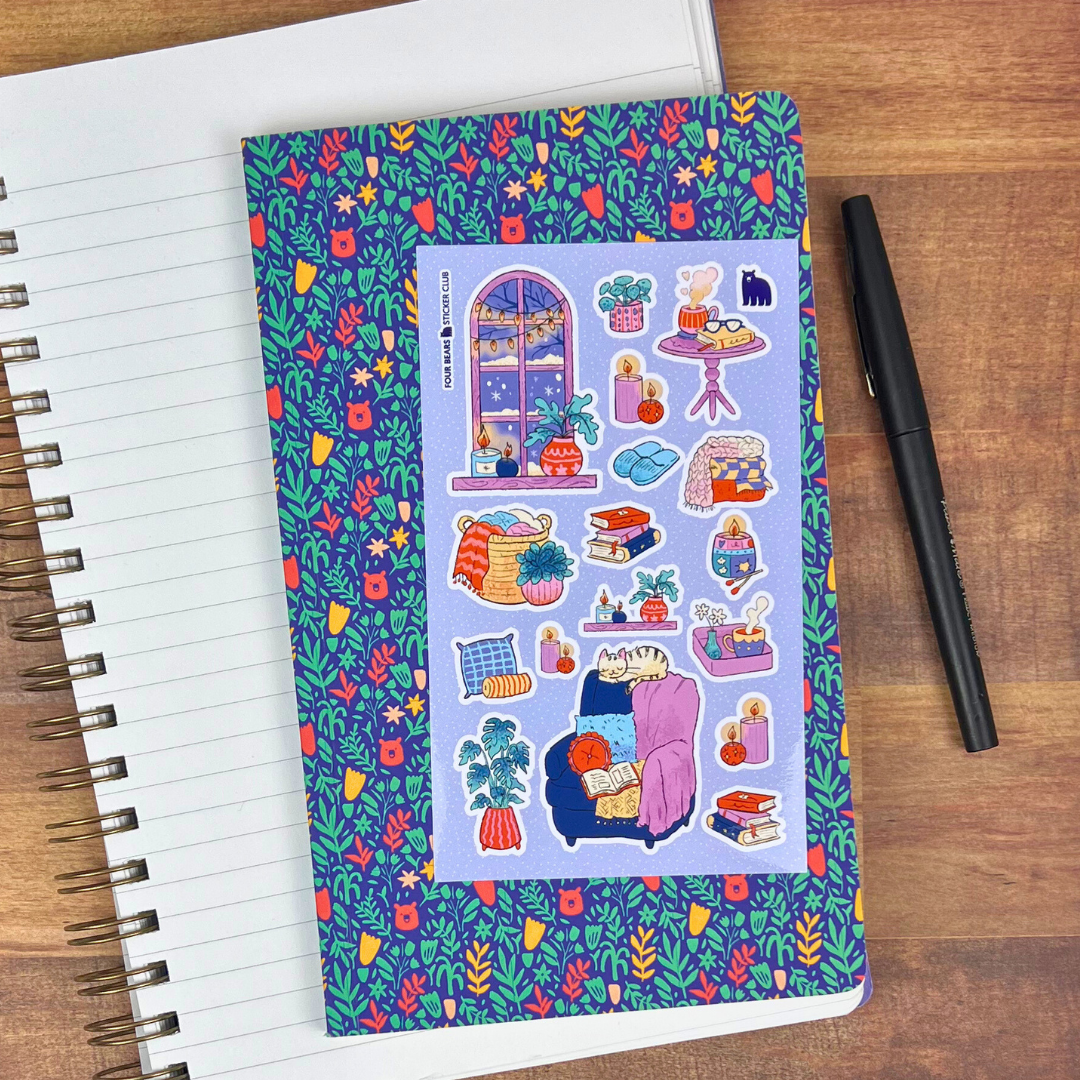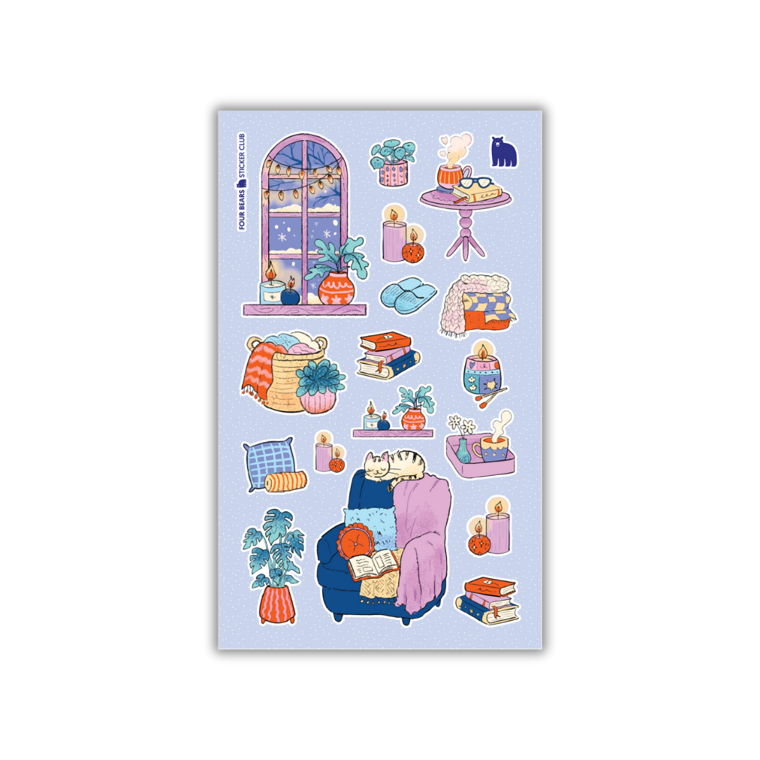 Settle into the warmth of winter with Fireside Retreat, a cozy sticker sheet filled with plush chairs, glowing candles, soft blankets, and a peaceful window view of falling snow. Every illustration captures the tactile comfort of quiet winter evenings, the kind where you curl up with a warm drink and watch the world turn frosty outside.