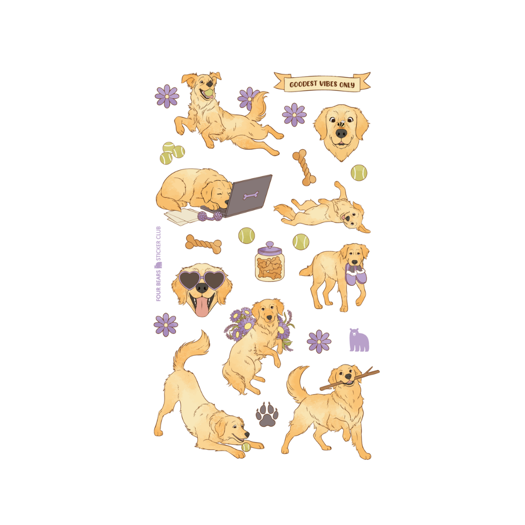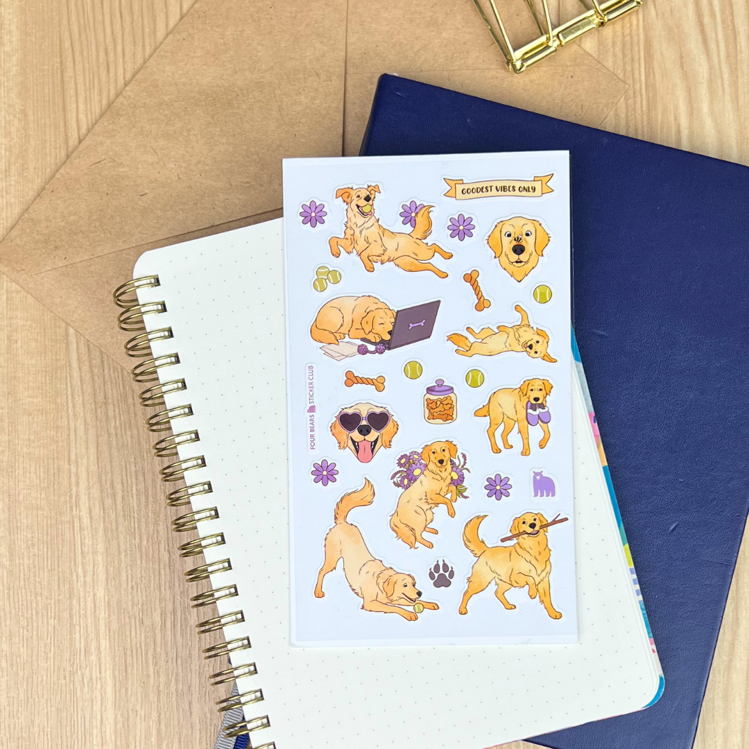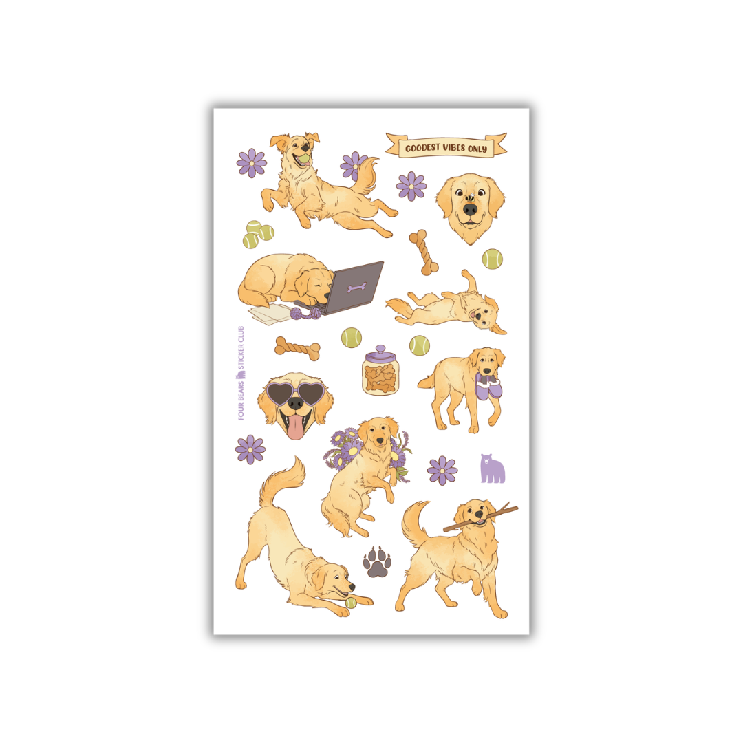 Goodest Vibes Only is pure joy in sticker form. Featuring golden retrievers radiating warmth and optimism, this sheet leans into sunshine energy with a playful twist. Whether you’re marking a good day, decorating a weekly spread, or sending encouragement in the mail, these pups bring instant positivity without trying too hard. It’s the kind of sheet that makes you smile every time you see it.