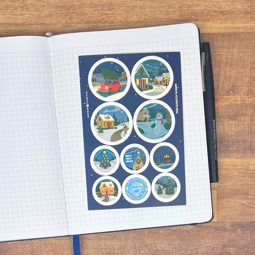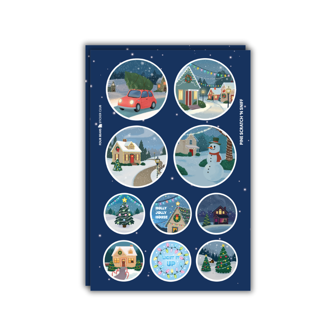 Bring the scent of the season to your pages! This pine-scented sheet features a glowing neighbourhood at night - houses trimmed in lights, cars carrying Christmas trees, and snowy streets full of holiday charm.