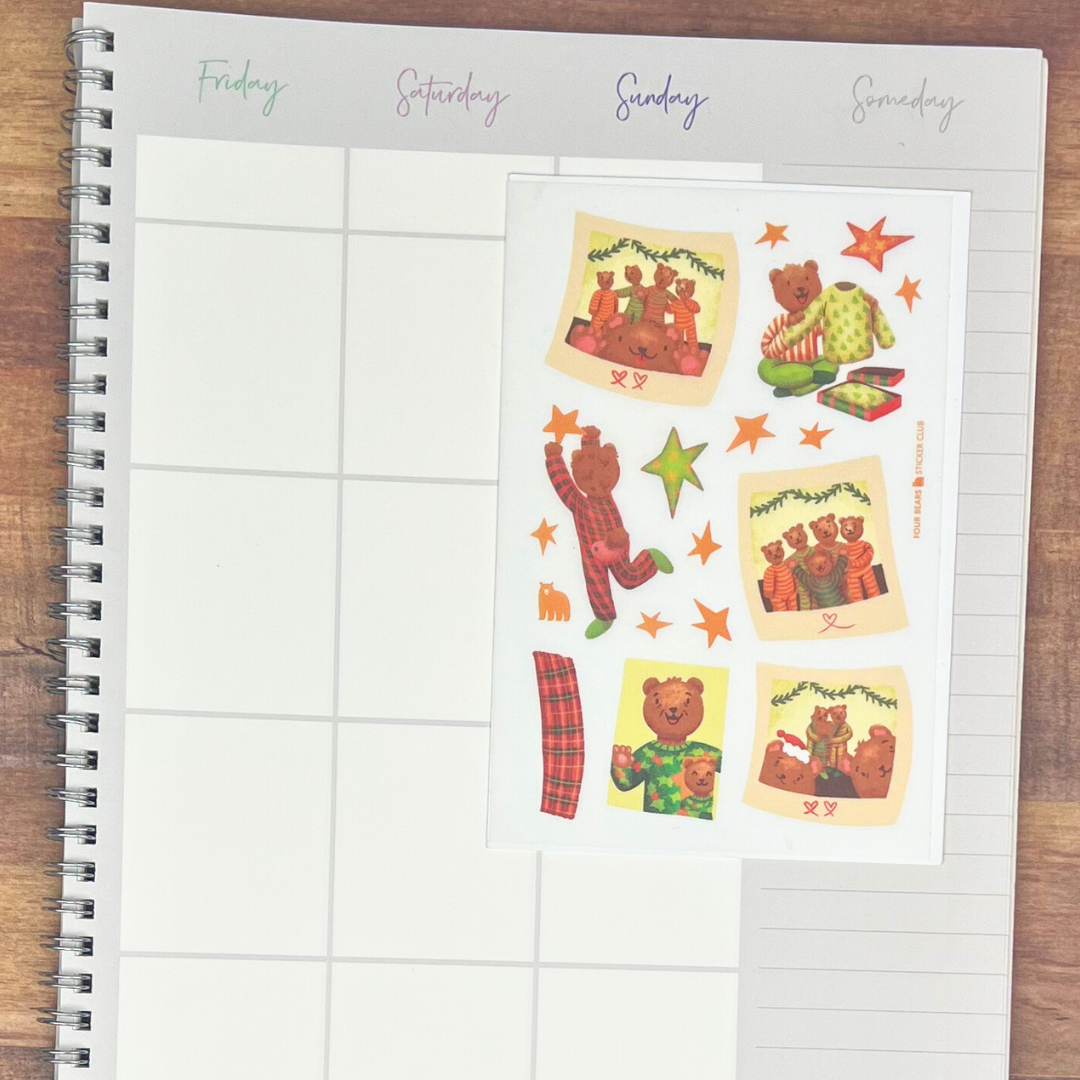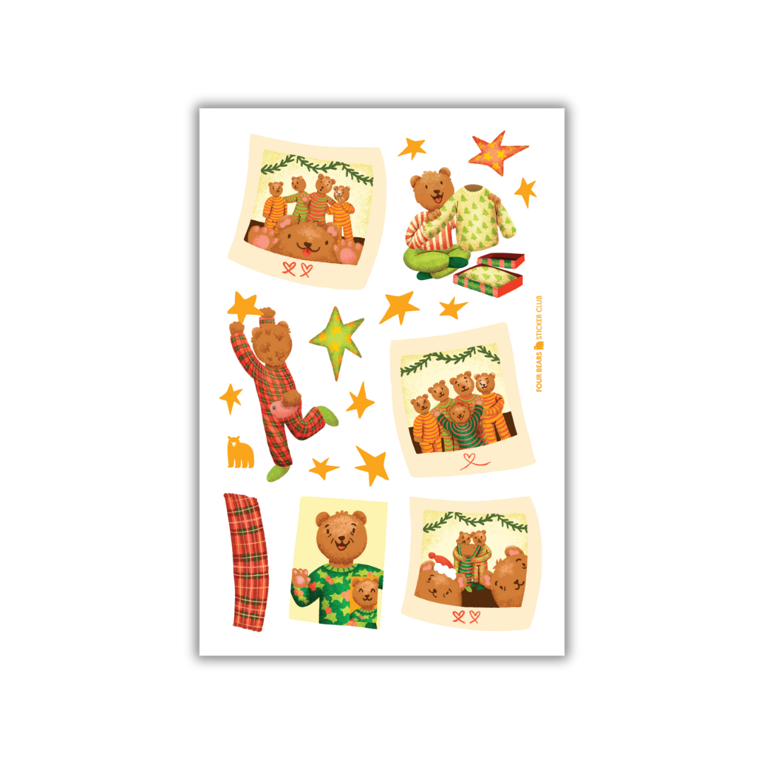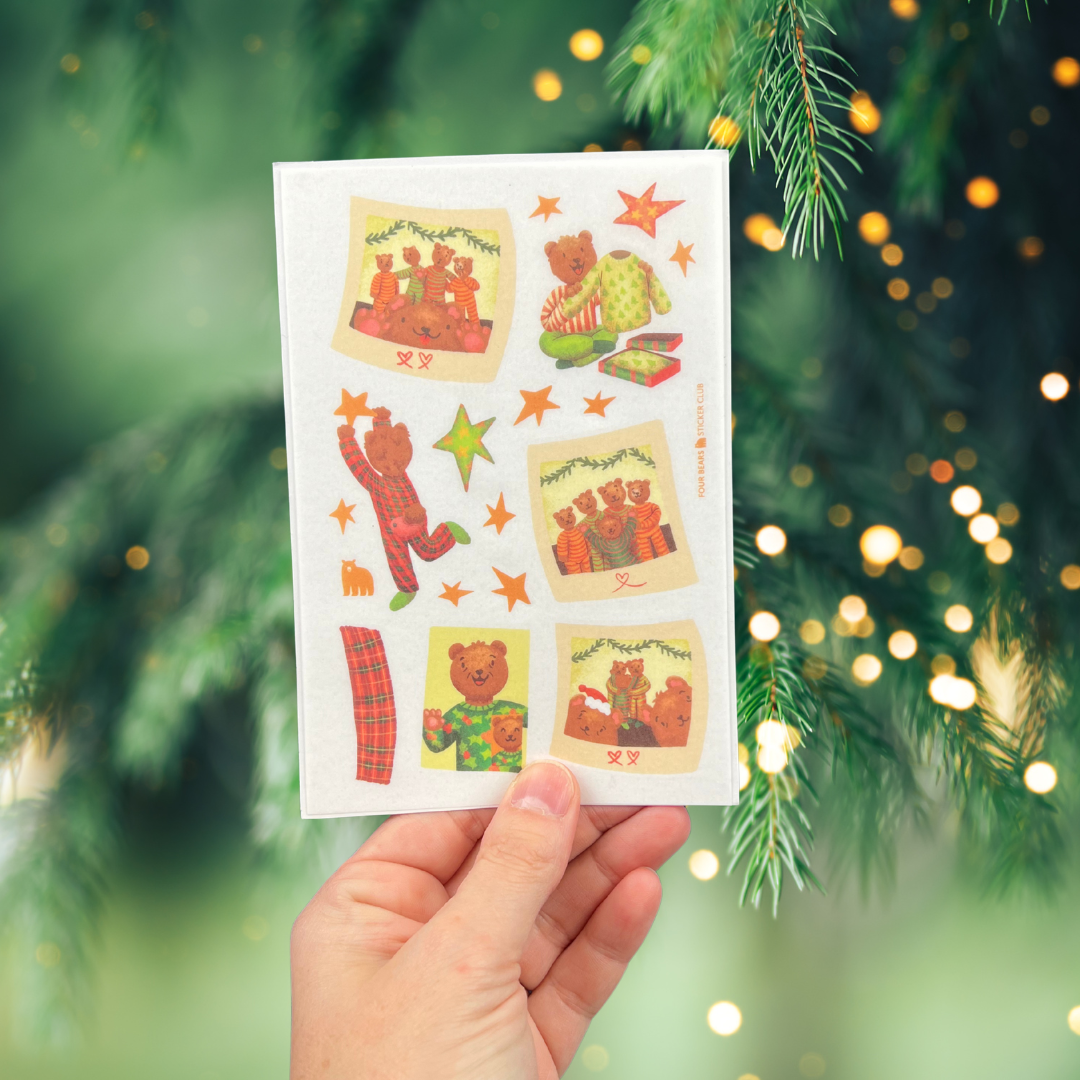 A family tradition brought to life in stickers! These adorable bears show off their matching holiday pyjamas; opening presents, posing for photos, getting goofy, and soaking up Christmas Eve excitement.