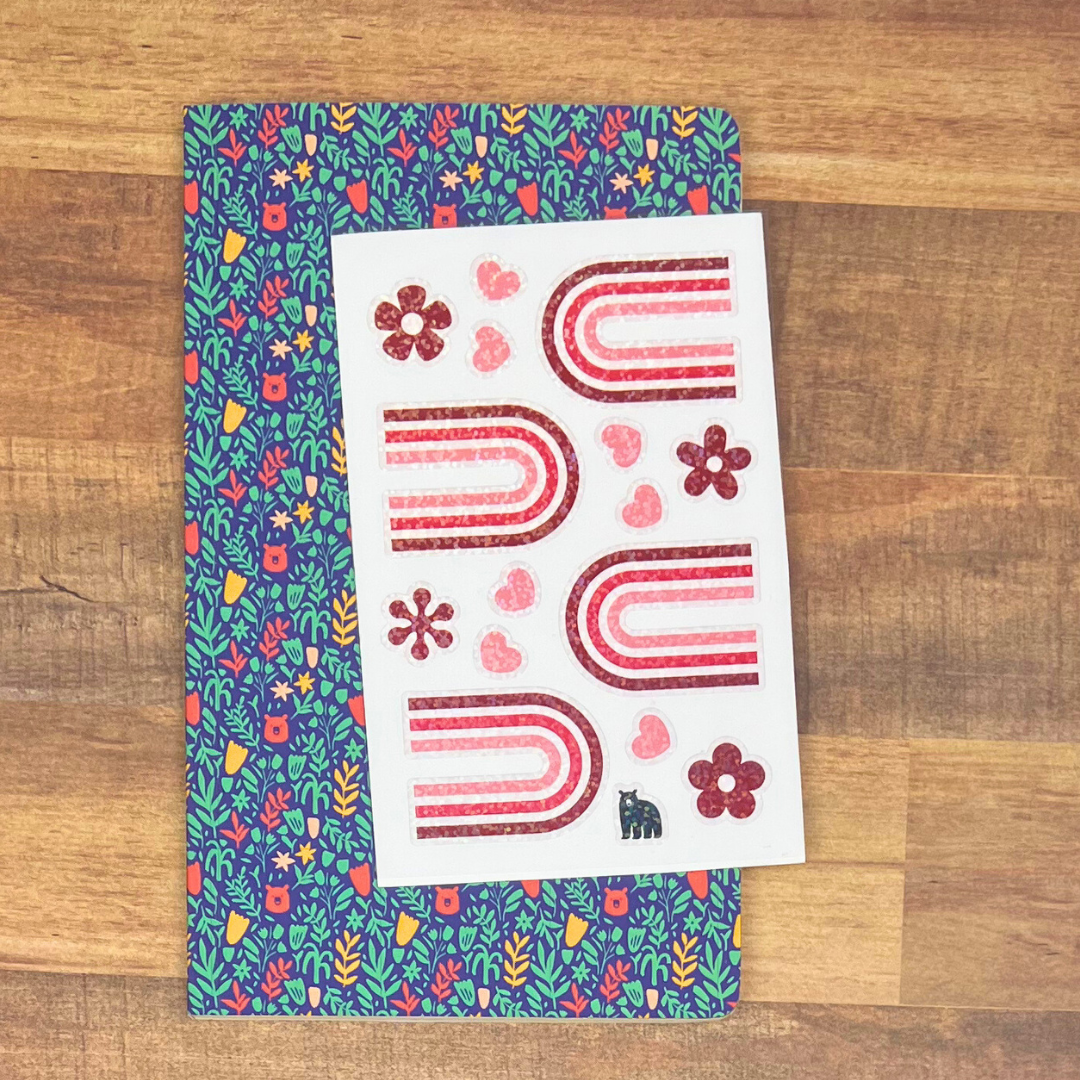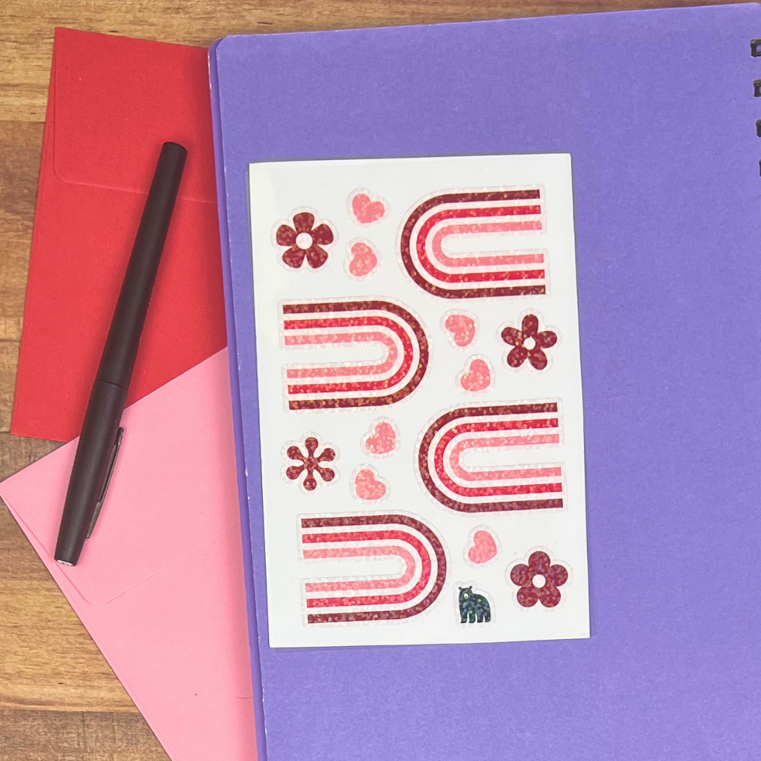 White PVC stickers on a clear backing with a sparkle overlay