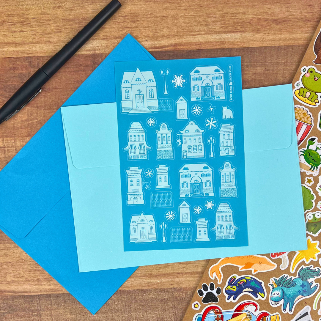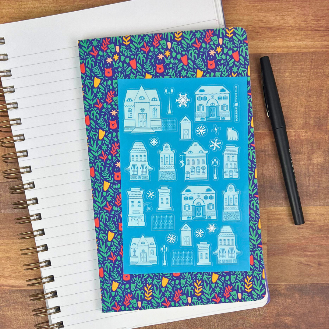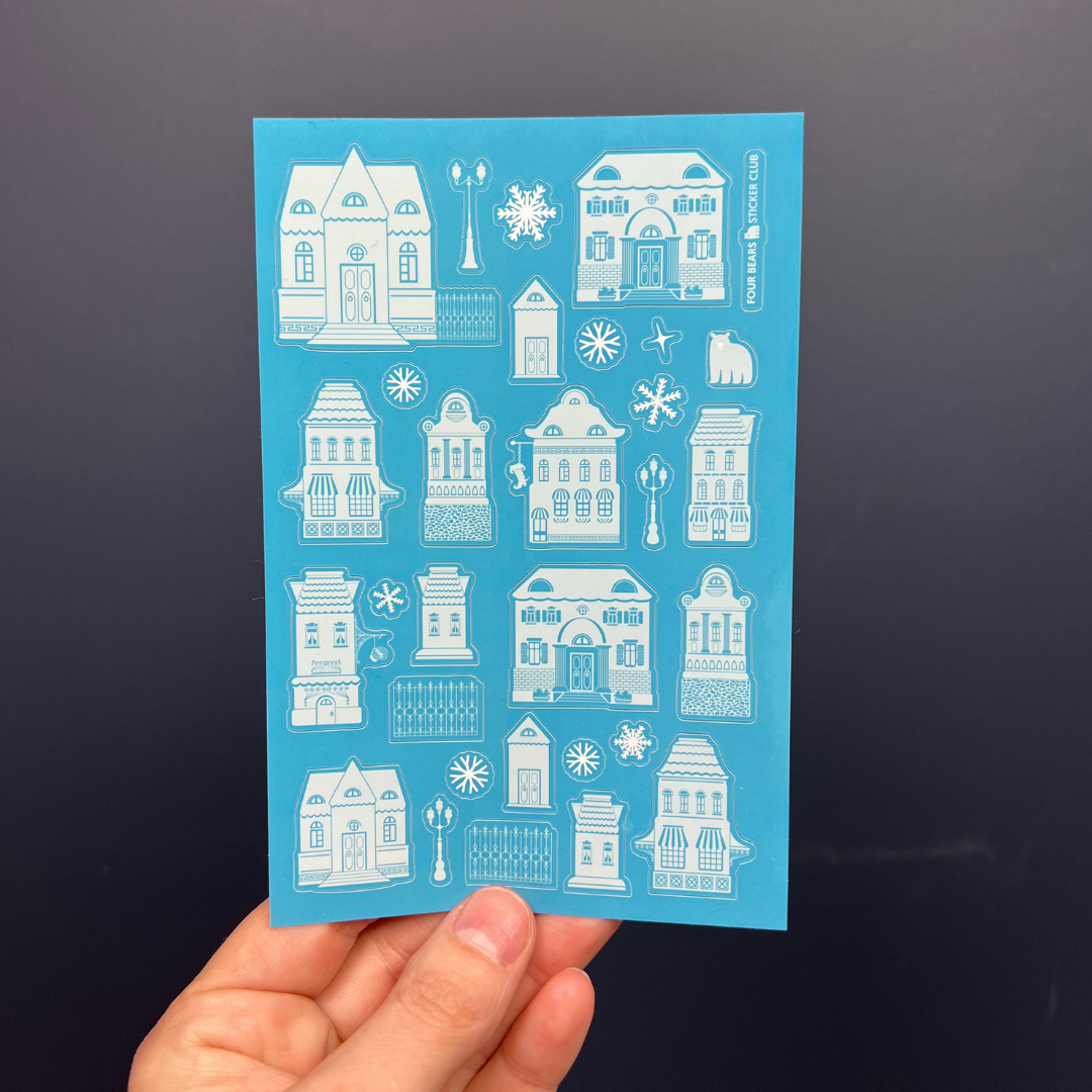 Wander through a peaceful winter town with Snowy Village, a charming sticker sheet featuring quiet streets, covered in snow.
