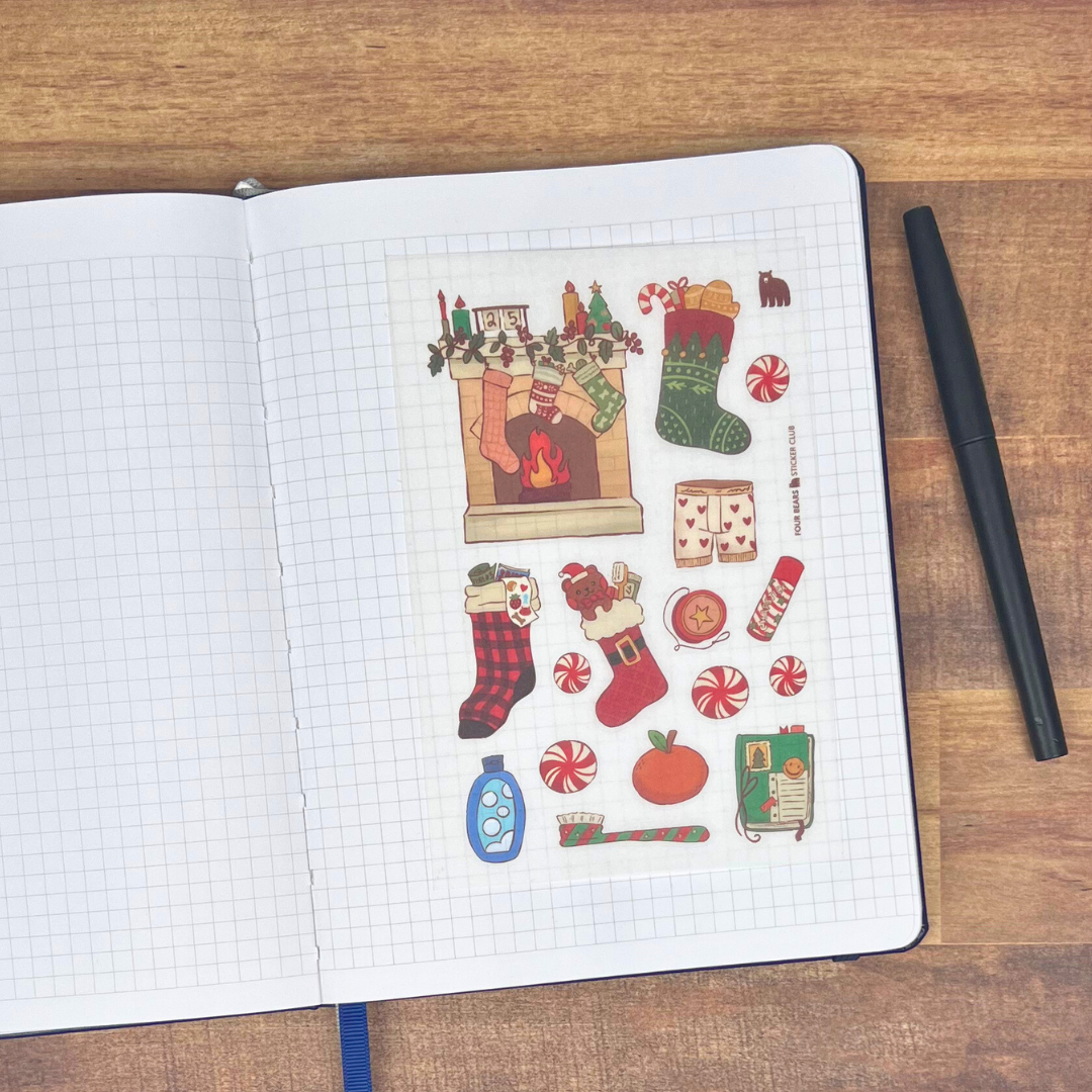 Stuff your pages full of holiday fun! This sheet features a cozy fireplace scene, mix-and-match stockings, and all the little treasures you might tuck inside: candies, fruit, tiny toys, and other Christmas surprises.
