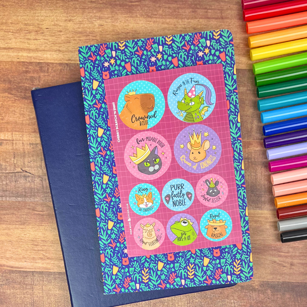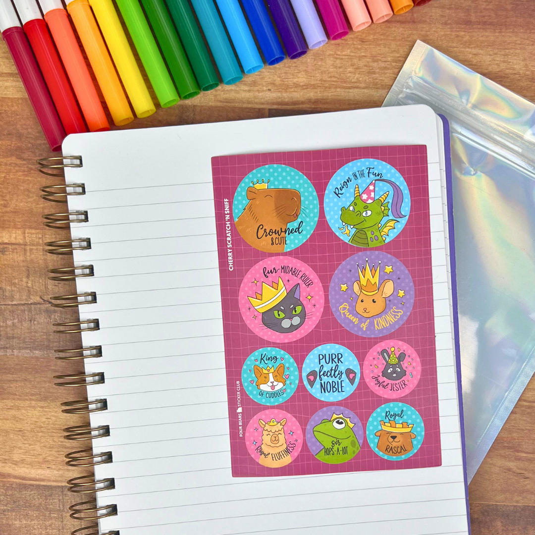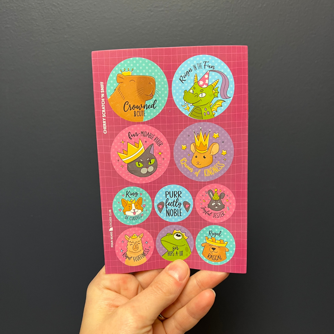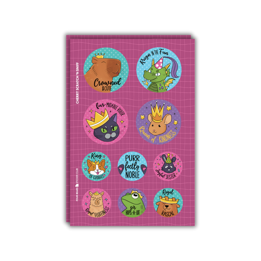Meet the Sweet Royals! This delightful, cherry-scented Scratch-N-Sniff sticker sheet features adorable animals wearing crowns - a perfect mix of sweet, silly, and royally fun. With every scratch, these tiny rulers bring a pop of fruity cheer and imagination to playtime.