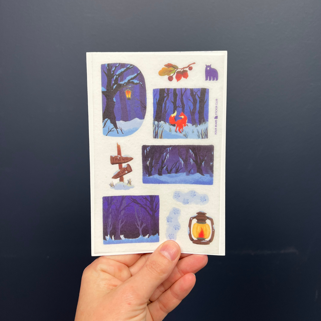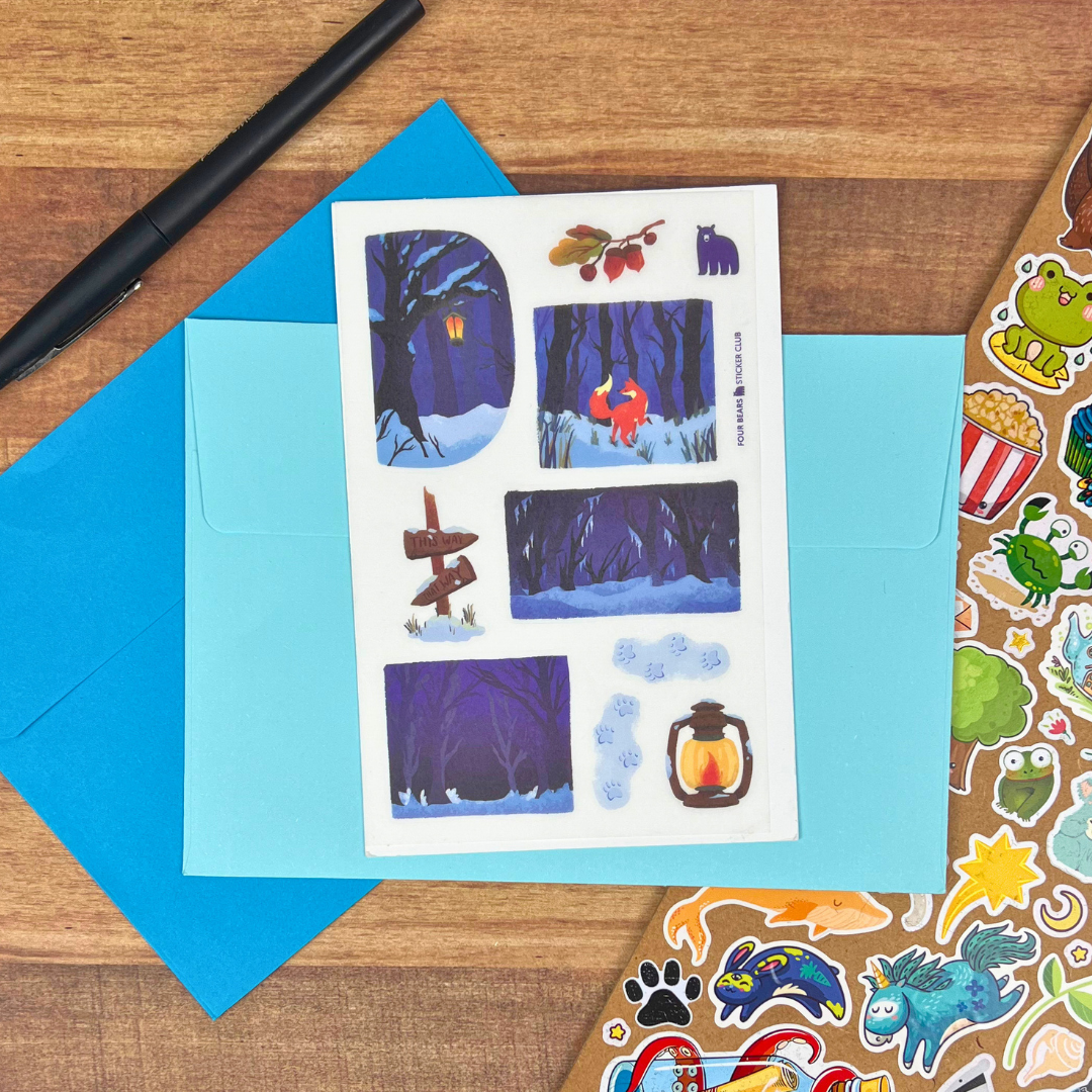 Step into a quiet winter tale with This Way to Winter, a beautifully illustrated sticker sheet featuring snowy forest scenes, softly glowing lanterns, and a bright fox leading the way down frosted paths. Designed to capture the stillness, wonder, and gentle magic of the season, this sheet is a centrepiece of the Frost & Fables collection.