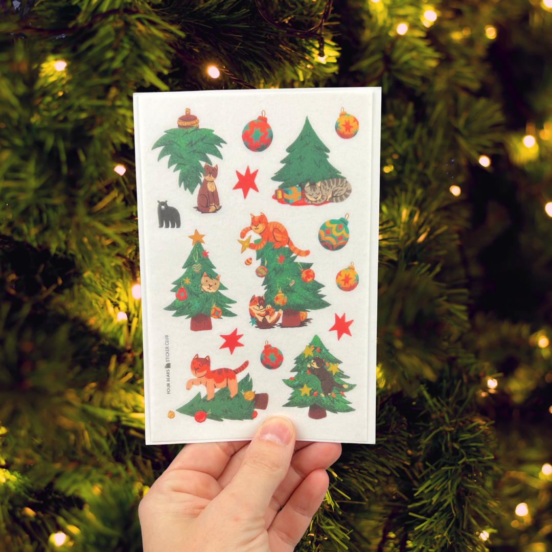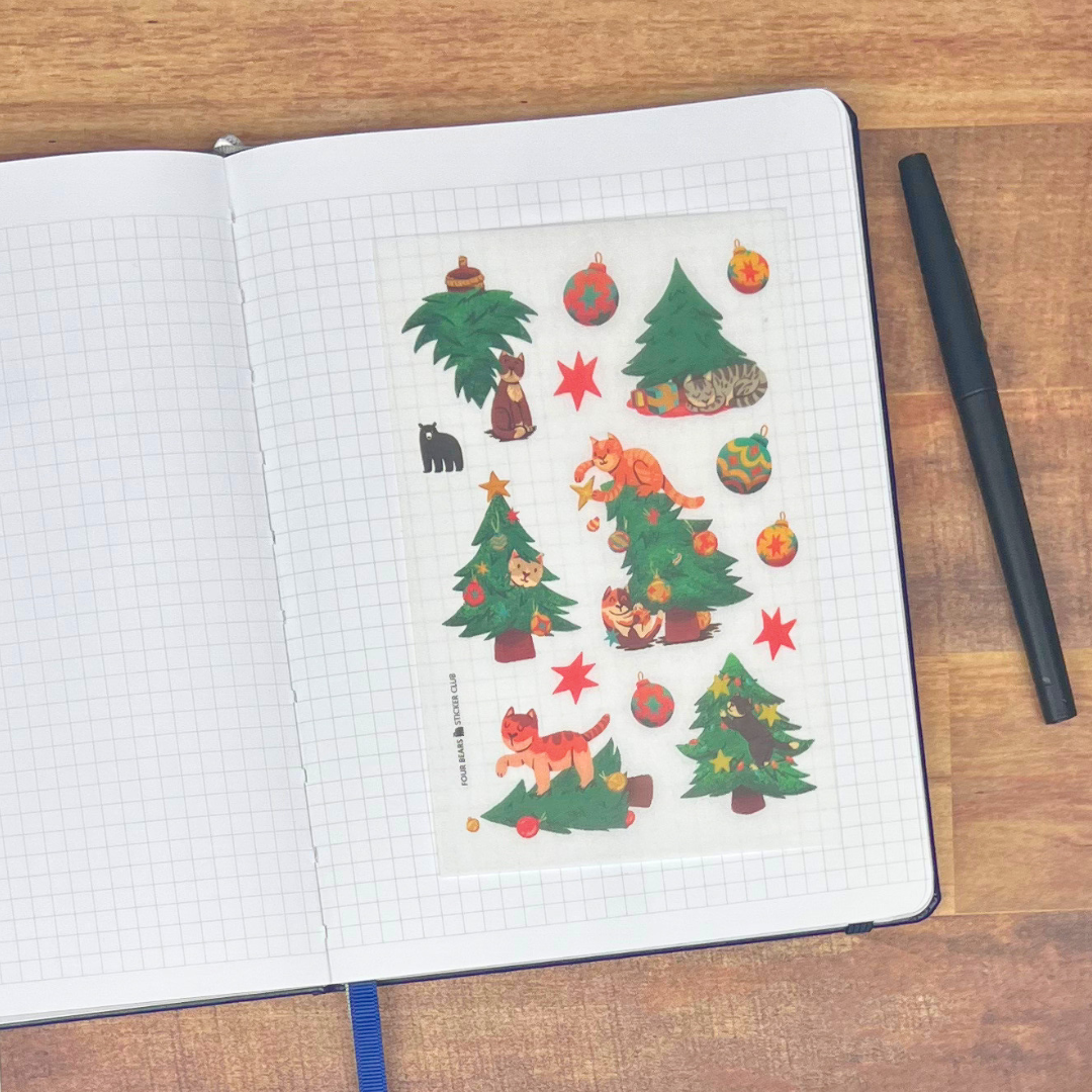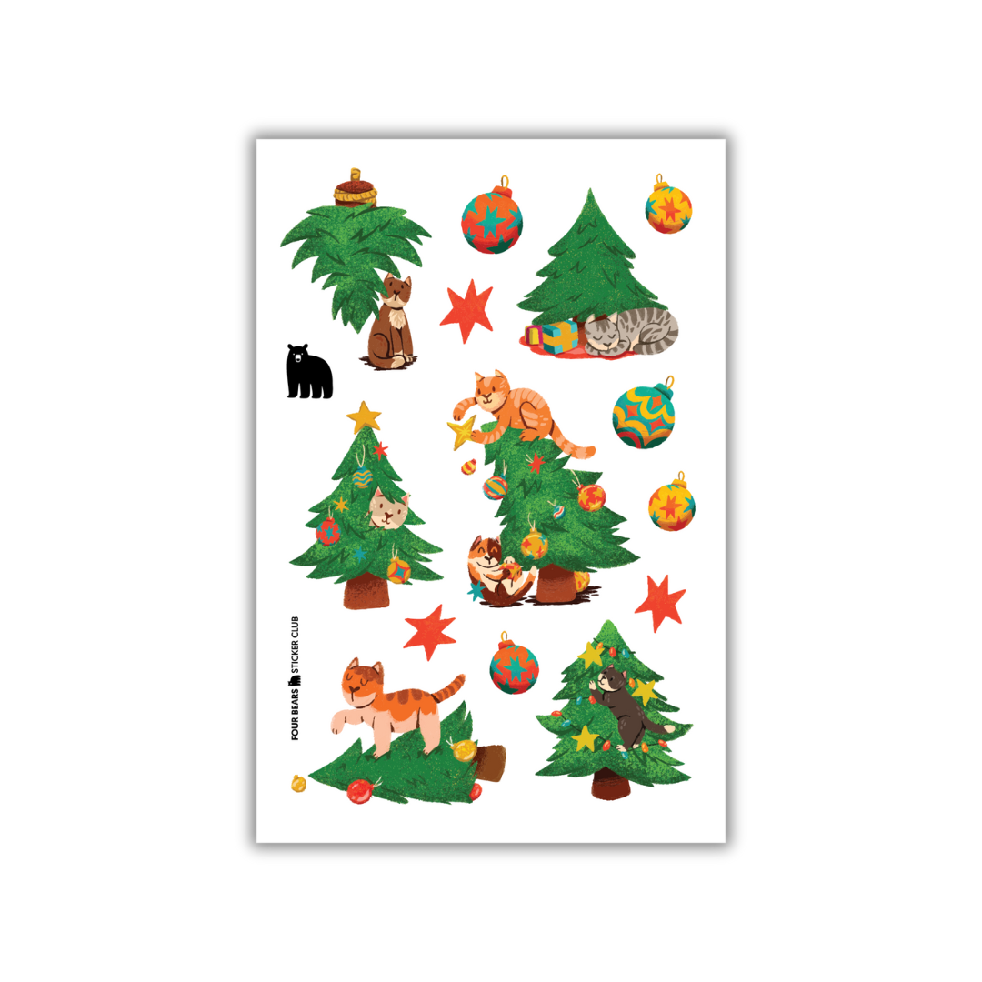 Cats + Christmas trees = chaos! This playful sheet captures all the feline shenanigans from climbing the tree, knocking ornaments down, getting tangled in lights, and even trying to topple the whole thing. One tree is cleverly upside down to keep the cat out!